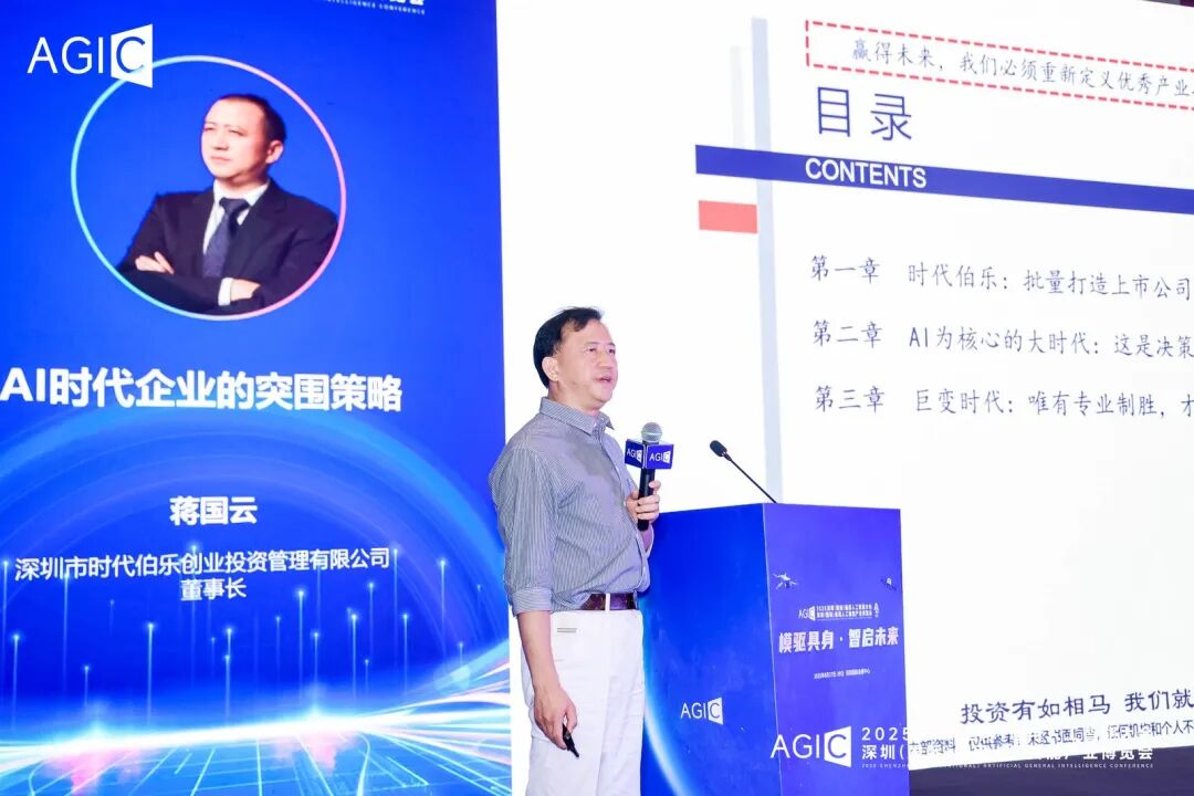 作为协会高度认可的专业产业投资机构,时代伯乐董事长蒋国云博士受邀出席,并发表以“AI 时代企业突围之道”为题的演讲。蒋博士从投资哲学、宏观研判与企业战略三个维度,系统阐述了人工智能带来的颠覆性变革与企业的应对之策。